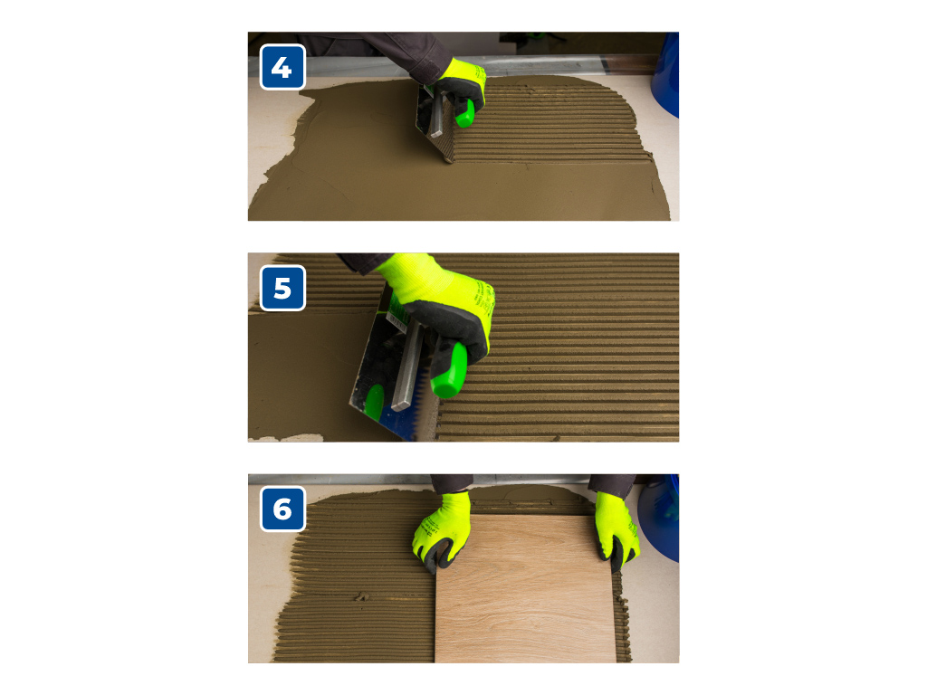 Готовую растворную смесь равномерно нанести на основание с помощью гладкого шпателя и придать гребенчатую структуру зубчатым. Размер зубца шпателя следует выбирать, исходя из ровности основания, а также размера и типа плитки. При более грубом основании следует применять шпатель с большей высотой зубца, для крупноформатной керамогранитной плитки размером 600х600 мм и более следует использовать зубчатый шпатель не менее 8 мм.