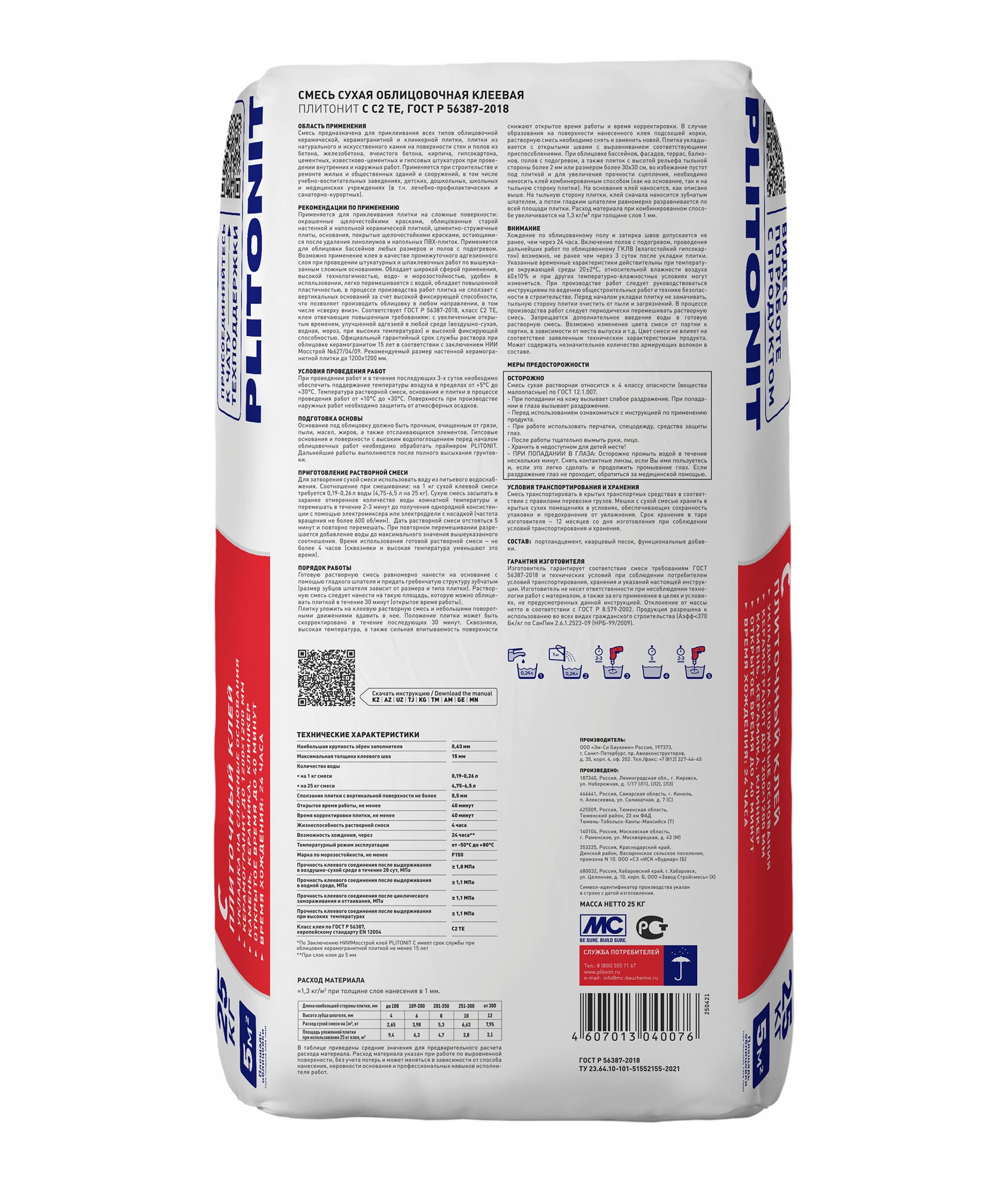 Изготовитель гарантирует соответствие смеси требованиям ГОСТ 56387 класс С2 ТЕ и технических условий при соблюдении потребителем условий транспортирования, хранения и указаний настоящей инструкции. Изготовитель не несет ответственности при несоблюдении технологии работ с материалом, а также за его применение в целях и условиях, не предусмотренных данной инструкцией. Отклонение от массы нетто в соответствии с ГОСТ 8.579-2002. Продукция разрешена к использованию во всех видах гражданского строительства (Аэфф<370 Бк/кг, по НРБ-99/2009 СанПиН 2.6.1.2523–09).