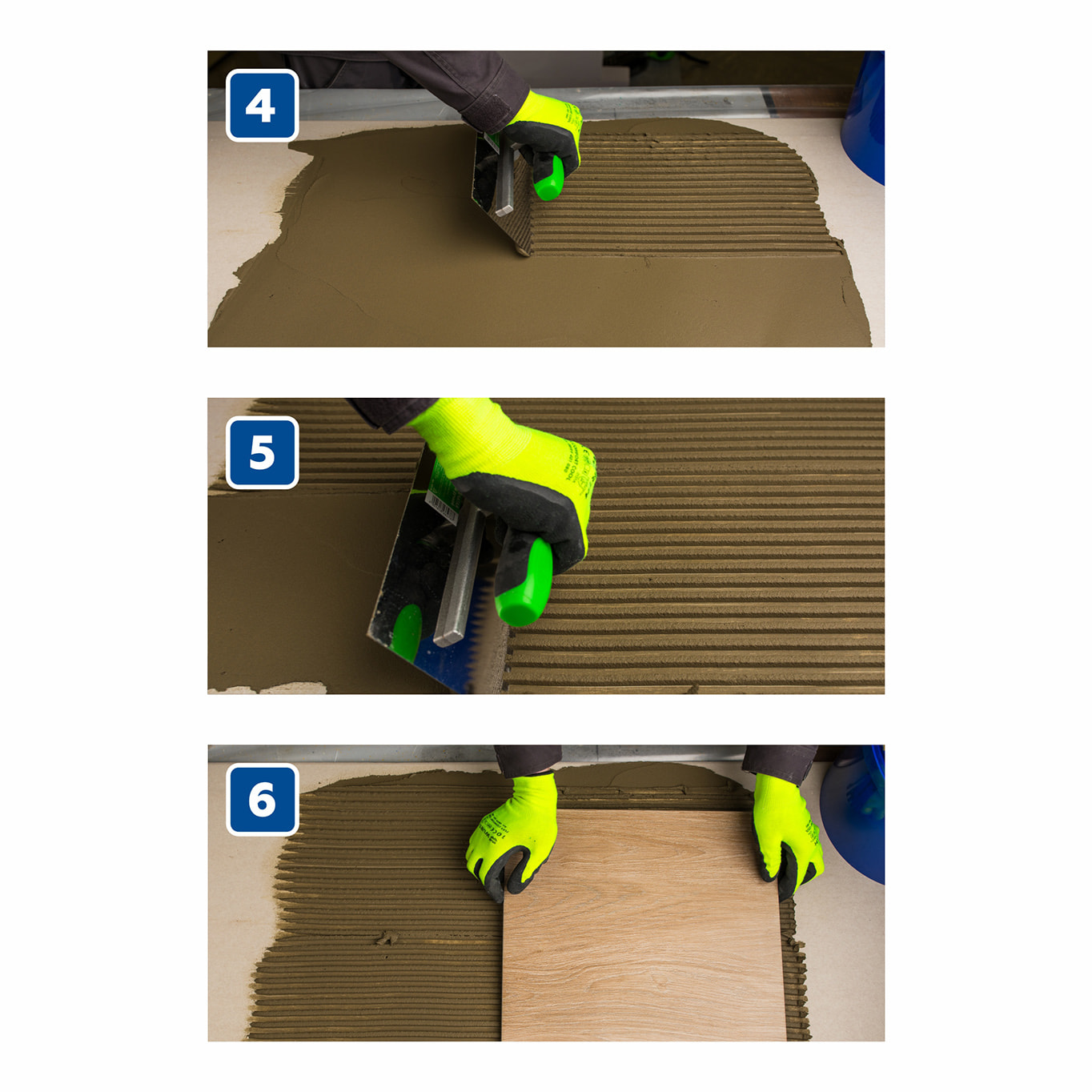 При производстве работ необходимо руководствоваться требованиями СП 71.13330 (раздел 7). Готовую растворную смесь равномерно нанести на основание с помощью гладкого шпателя и придать гребенчатую структуру зубчатым (размер зубцов шпателя зависит от размера и типа плитки). Растворную смесь следует нанести на такую площадь, которую можно облицевать плиткой в течение 30 минут (открытое время работы). Плитку уложить на клеевую растворную смесь и небольшими поворотными движениями вдавить в нее. Положение плитки может быть скорректировано в течение последующих 30 минут. Сквозняки, высокая температура, а также сильная впитывающая способность поверхности снижают открытое время работы и время корректировки. В случае образования на поверхности нанесенного клея подсохшей корки, растворную смесь необходимо снять и заменить новой. Плитка укладывается с открытыми швами с выравниванием соответствующими приспособлениями. При облицовке бассейнов, фасадов, террас, балконов, полов с подогревом, а также плиток с высотой рельефа тыльной стороны более 2 мм или размером более 30х30 см, во избежание пустот под плиткой и для увеличения прочности сцепления, необходимо наносить клей комбинированным способом (как на основание, так и на тыльную сторону плитки). На основание клей наносится, как описано выше. На тыльную сторону плитки, клей сначала наносится зубчатым шпателем, а потом гладким шпателем равномерно разравнивается по всей площади плитки. Расход материала при комбинированном способе увеличивается на 1,3 кг/м² при толщине слоя 1 мм.
